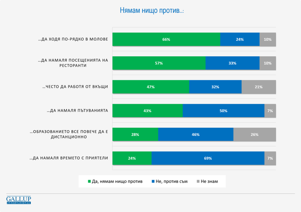 Любопитното е, че работата от къщи събира осезаема подкрепа – 47% не биха имали нищо против често да работят от къщи, а 32% намират аргументи против. Не се открива изявена подкрепа за дистанционното обучение. Тук обществото реагира по-скоро предпазливо и 46% се обявяват „против“, а 28% са „за“. Има и цели 26%, които не могат да преценят. И тук е видима разликата в готовността на различните поколения да приемат нововъведения. А и може би немалко родители не биха искали децата да остават вкъщи.