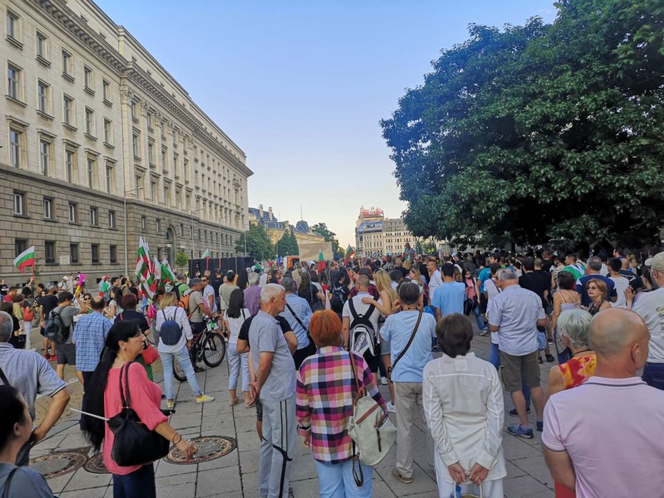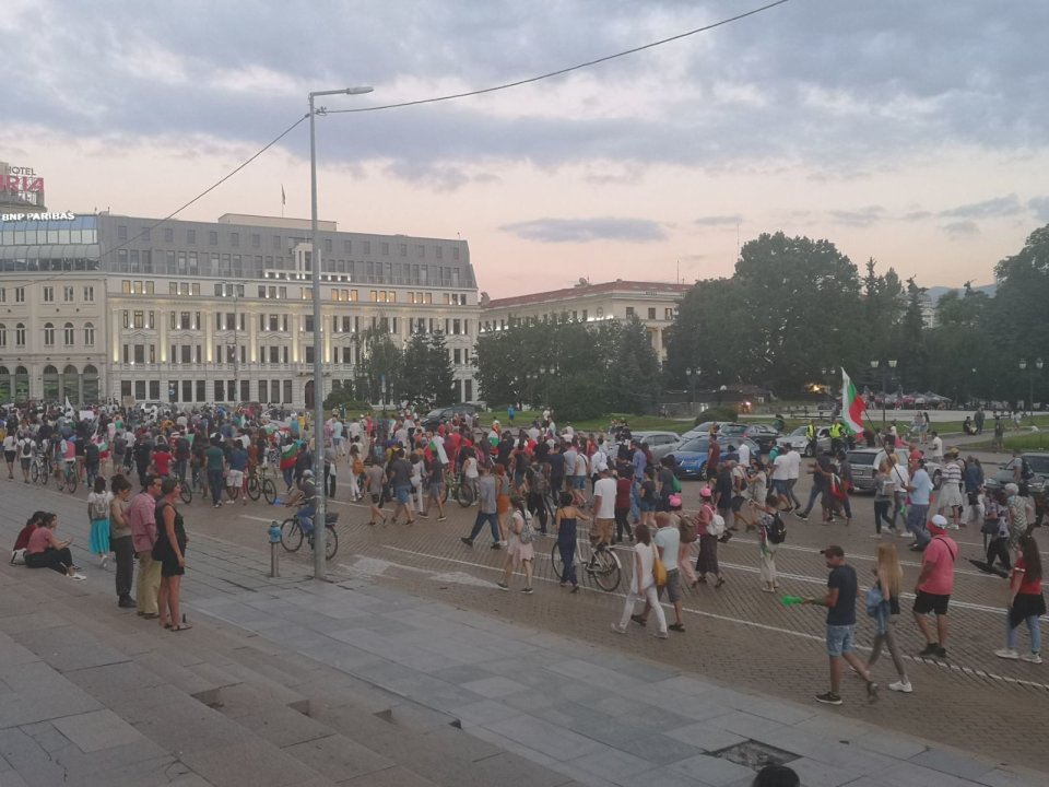 Протестът протича мирно, хората скандират, надуват свирки и вувузели. Полицейското присъствие е засилено както всяка вечер.