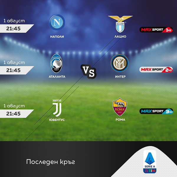 През уикенда ще паднат и всички неизвестни около Серия А с изиграването на последния XXXVIII кръг на Ботуша. В събота от 21.45 часа феновете ще могат да се насладят на три страхотни сблъсъка. По MAX Sport 1 Наполи приема борещия се за второто място тим на Лацио, докато по MAX Sport 3 шампионът Ювентус посреща борещия се за участие в Лига Европа Рома. Мегасблъсъкът между Аталанта и Интер ще е в ефира на MAX Sport 2. Победителят от този двубой ще си гарантира втората позиция в крайното класиране, докато едно евентуално равенство на „Атлети адзури“ в Бергамо и победа на Лацио в Неапол ще донесе сребърните медали на римските „орли“. Веднага след края на мачовете, по MAX Sport 3 ще бъде излъчено и награждаването на Ювентус с деветата поредна титла.