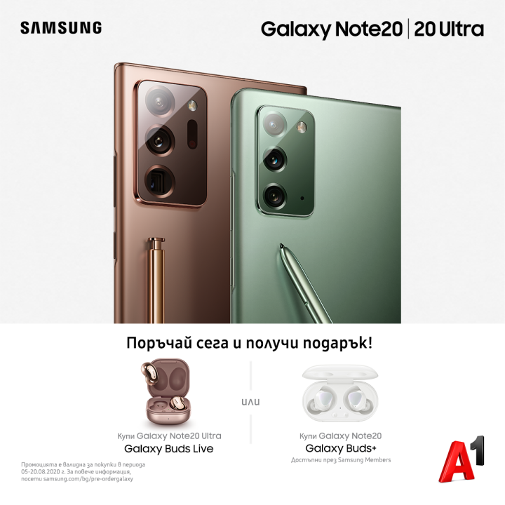 Предварителните поръчки на сайта са валидни при покупка с нов тарифен план от А1. От тях могат да се възползват както настоящи клиенти на телекома, така и нови, които искат да се прехвърлят към А1, използвайки възможността да закупят ново устройство на изплащане. Цените на Samsung Galaxy Note20 започват от 57,99 лева на месец или 1289,99 лева в брой, при поръчка с тарифен план A1 One Unlimited 5XL. По-големият модел Note20 Ultra се предлага за 1819,99 лева в брой или за 81,99 на месец, отново със същия тарифен план.