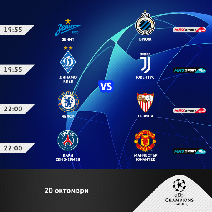 Двата дебютни мача за сезон 2020-2021 са с начален час 19:55 ч. и ще противопоставят Зенит срещу Брюж, пряко по MAX Sport 2, както и Динамо (Киев) и Ювентус, в ефира на MAX Sport 3. „Бианконерите“ на Андреа Пирло не стартираха много успешно новия сезон в Серия А и имат едва две победи в първите си четири мача. Звездата на тима Кристиано Роналдо, пък ще пропусне двубоя в Киев, тъй като е под карантина заради положителен тест за коронавирус.