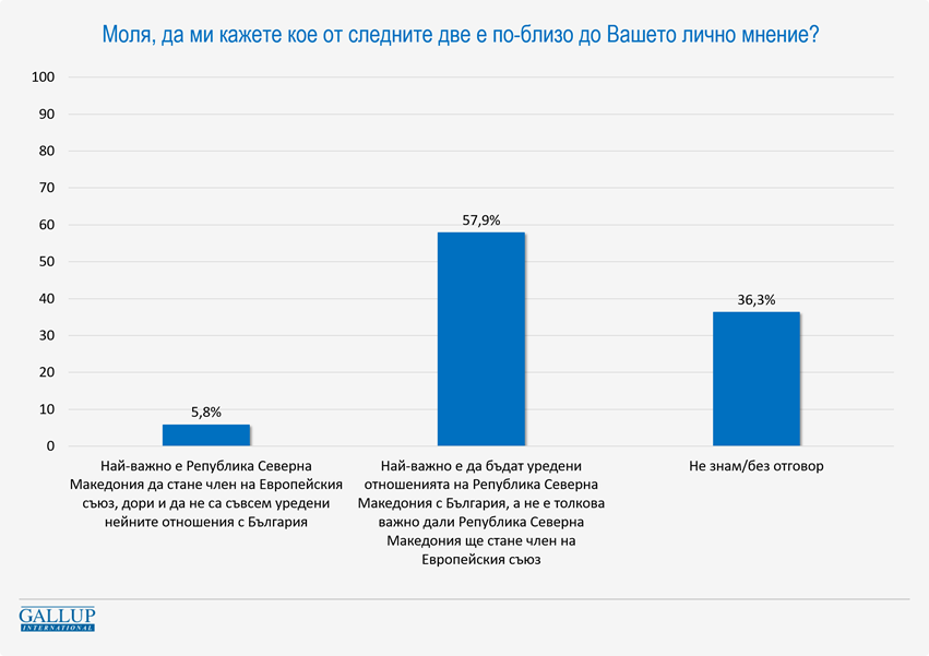 Според 57,9% е по-важно е по-важно да бъдат уредени отношенията на Северна Македония с България, отколкото страната да стане член на ЕС.