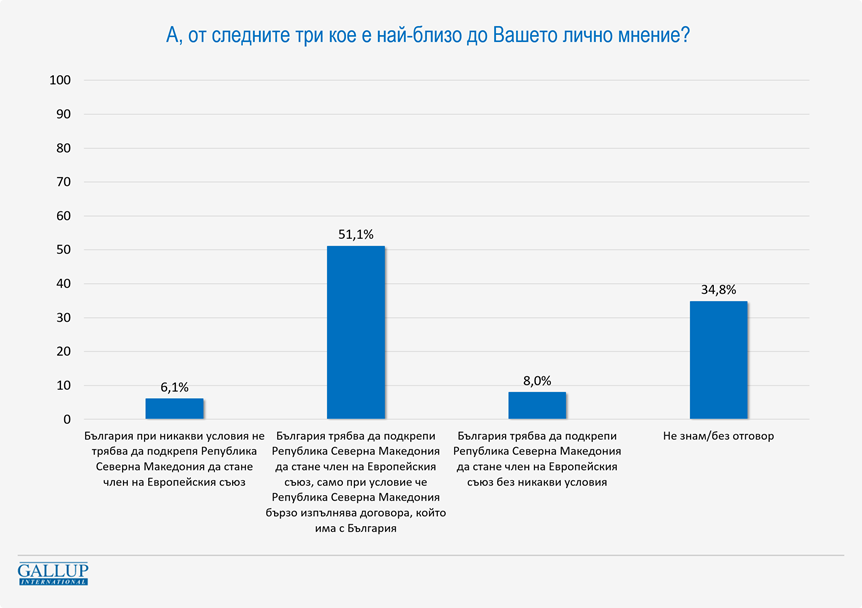 И все пак безусловна подкрепа за членство в ЕС дават само 8%. Чувствително мнозинство от 51,1% избира опцията „България трябва да подкрепи Република Северна Македония да стане член на Европейския съюз, само при условие че Република Северна Македония бързо изпълнява договора, който има с България“.