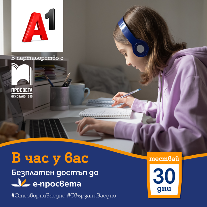 Днес стартира нова кампания на А1 и издателство „Просвета“, която има за цел да насърчи електронно образование в страната с помощта на дигиталните технологии. Двете компании ще осигурят 30-дневен безплатен достъп до образователната платформа e-prosveta.bg за всички потребители. Съдържанието на платформата е създадено по учебните програми на Министерството на образованието и науката и е подходящо за учещите по учебниците от всички издателства. А1 ще осигури и безплатен трафик до e-prosveta.bg до края на годината за своите клиенти на мобилна услуга. Така децата им ще могат да се учат, без това отнема от мегабайтите на максимална скорост, които са включени в абонамента им.