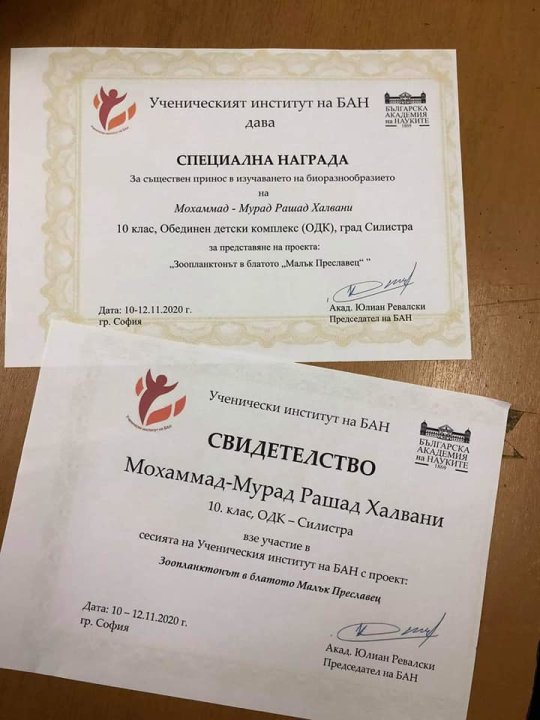 В направление биология, биоразнообразие и биомедицина Мохаммад-Мурад Рашад Халвани от Екоклуб „Пеликан“ към ОДК–Силистра представи свой проект за зоопланктона в блатото Малък Преславец, който бе оценен високо. Мохаммад бе отличен със специалната награда за съществен принос в изучаване на биоразнообразието, съобщава пресцентърът на Община Силистра.