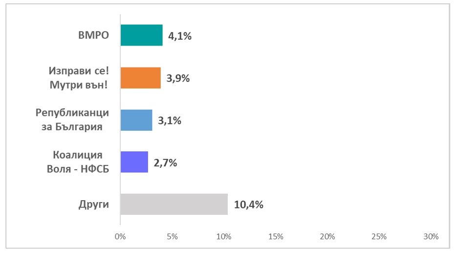 Коалицията между „Воля“ и НФСБ е с 2,7% . Този дял към момента е хипотетичен и ориентировъчен, тъй като тепърва ще мерим електоралната тежест на тези две партии в коалицията, която обявиха преди дни (по време на теренната работа на настоящото изследване).