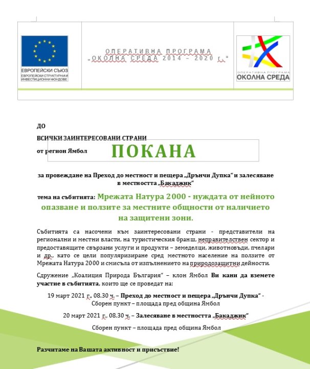За да се включите в прехода до местността и пещерата, елате на 19 март на площада пред Община Ямбол в 8.30 часа.