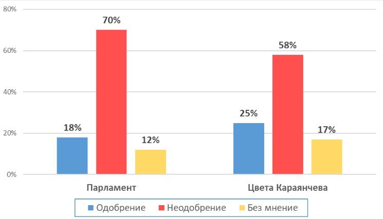 Ако сравним сегашното одобрение на 44-то Народно събрание в края на неговия мандат, с одобрението на 43-то Народно събрание също в края на неговия мандат, то по данни на „Екзакта“ отсъства каквато и да е значима отлика в оценките. И тогава, и сега, одобрението към парламента е на стойност между 17 и 18%, а неодобрението и към двата състава се доближава до 70%. Нека припомним и обществените оценки за работата на парламента в края на управлението на Пламен Орешарски, когато неодобрението към институцията достигна рекордните 83%, а одобрението се сви до 8.5%.