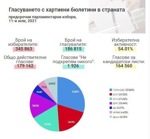 Според Института в България с хартиени бюлетини се е гласувало в 2495 секции. В избирателните списъци на тези секции е имало общо 327 425 души. От протоколите на комисиите става ясно, че по време на изборния ден са дописани още 18 438 души. Броят на подадените гласове е 186 815 – т.е. избирателната активност в тези секции е била 54.01%.