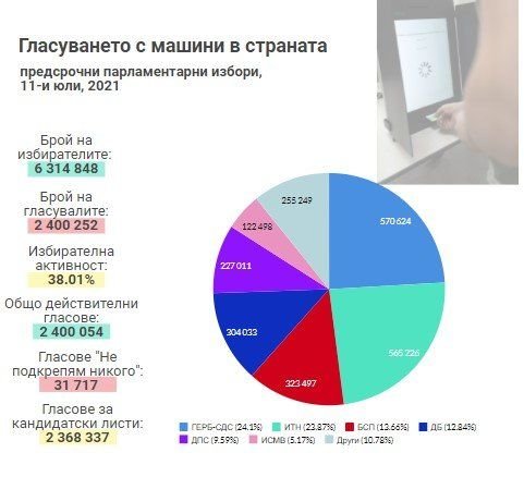 В секциите с машинно гласуване имаме разпределение на вота, което е почти идентично с това от крайните изборни резултати. Активността в тях обаче е по-ниска в сравнение с „хартиените”. Причините за разликата в активността може да са различни. Анализатори считат, че част от избирателите може да са се въздържали да дадат своя вот поради въвеждането на задължително машинно гласуване в секциите с над 300 души по списък (каквито са повечето в страната). Подобна теза се подкрепя от поглед върху избирателната активност през април в секциите, където отново се е гласувало само с хартиени бюлетини. Тогава те са били 2 596 (в това число не са включени 484 мобилни секции) и в тях гласа си са подали 202 362 избиратели от общо 342 610 по списък. Така избирателната активност на предишните парламентарни избори там е била 59.06%. Явно е, че спадът в активността е по-малък, отколкото общия за страната.