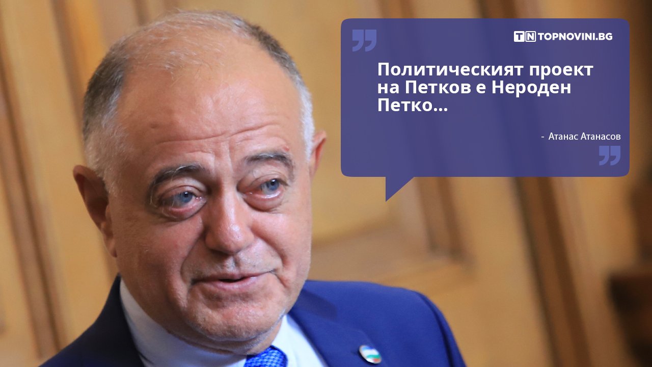 „Като казахте Кирил Петков, се сетих за Нероден Петко. Нека се роди, пък тогава ще го обсъждаме“, заяви съпредседателят на „Демократична България“ Атанас Атанасов в отговор на журналистически въпрос дали се притеснява от евентуалния нов политически проект на служебните министри Кирил Петков и Асен Василев.