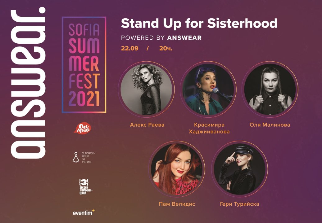 Благотворителното комедийно шоу „Stand up for Sisterhood“ ще събере на 22 септември от 20:00 часа пет популярни, смели и изключително забавни жени, които ще разкажат откровено за своите неуспехи и нефотогенични моменти на Sofia Summer Fest. Дългоочакваното събитие е режисирано от Стоян Радев и е по инициатива на Answear България.
