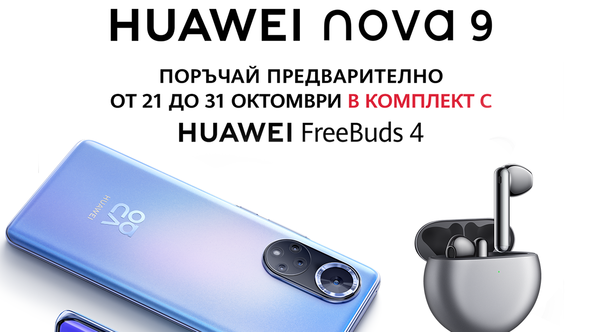 Официалният старт на продажбите на Huawei nova 9 във всички търговски канали на А1 е 1 ноември. Доставките ще започнат на 31 октомври по реда на поръчване, а всички заявили предварително nova 9, ще получат и последния модел безжични слушалки на Huawei - FreeBuds 4.