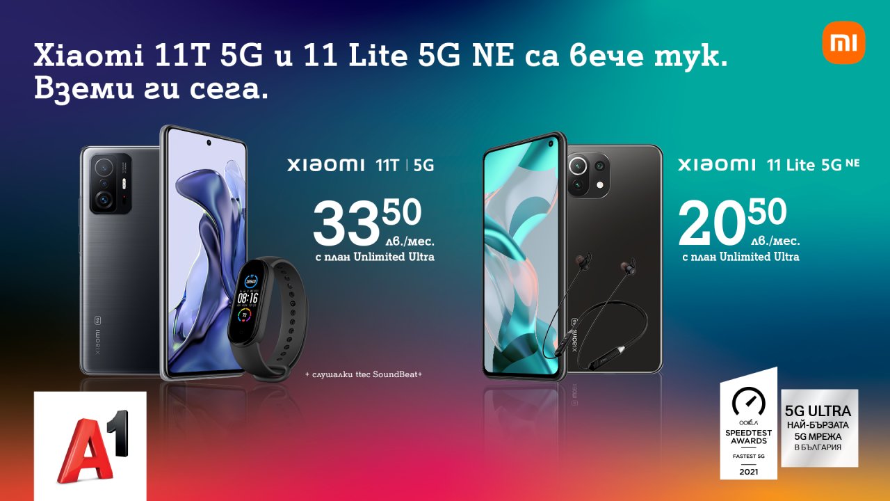 А1 обяви старта на продажбите на три нови смартфона на световния технологичен гигант Xiaomi. Сред новите предложения са водещите модели на компанията Xiaomi 11T и Xiaomi 11T Pro и представителят на бюджетния клас Xiaomi 11 Lite 5G NE. И трите модела са съвместими с мрежите от пето поколение и могат да се възползват от гигабитовите скорости на най-бързата 5G мрежа в България, според Ookla, 5G ULTRA.