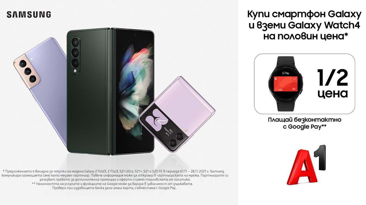 Важни новини за любителите на бранда Samsung обявяват от А1. От 1 до 28 ноември те могат да се възползват от специалното предложение в онлайн магазина на телекома. При покупка на определени смартфони от серията Galaxy на Samsung потребителите могат да добавят и смарт часовник Samsung от серията Watch 4 в своята поръчка и да го получат с намаление от 50 процента.