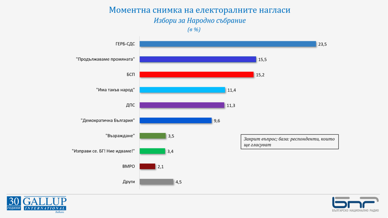 Ако изборите за Народно събрание бяха в края на първата десетдневка на ноември, ГЕРБ биха получили 23,5% от вота, „Продължаваме промяната“ и БСП са с равни шансове, съответно с 15,5% и 15,2%. „Има такъв народ“ се ползва с 11,4% електорална готовност, ДПС – 11,3%, „Демократична България“ – 9,6%. 3,5% от възнамеряващите да гласуват посочват „Възраждане“, 3,4% – „Изправи се, България! Ние идваме“, ВМРО – 2,1%. 4,5% ще предпочетат други опции.