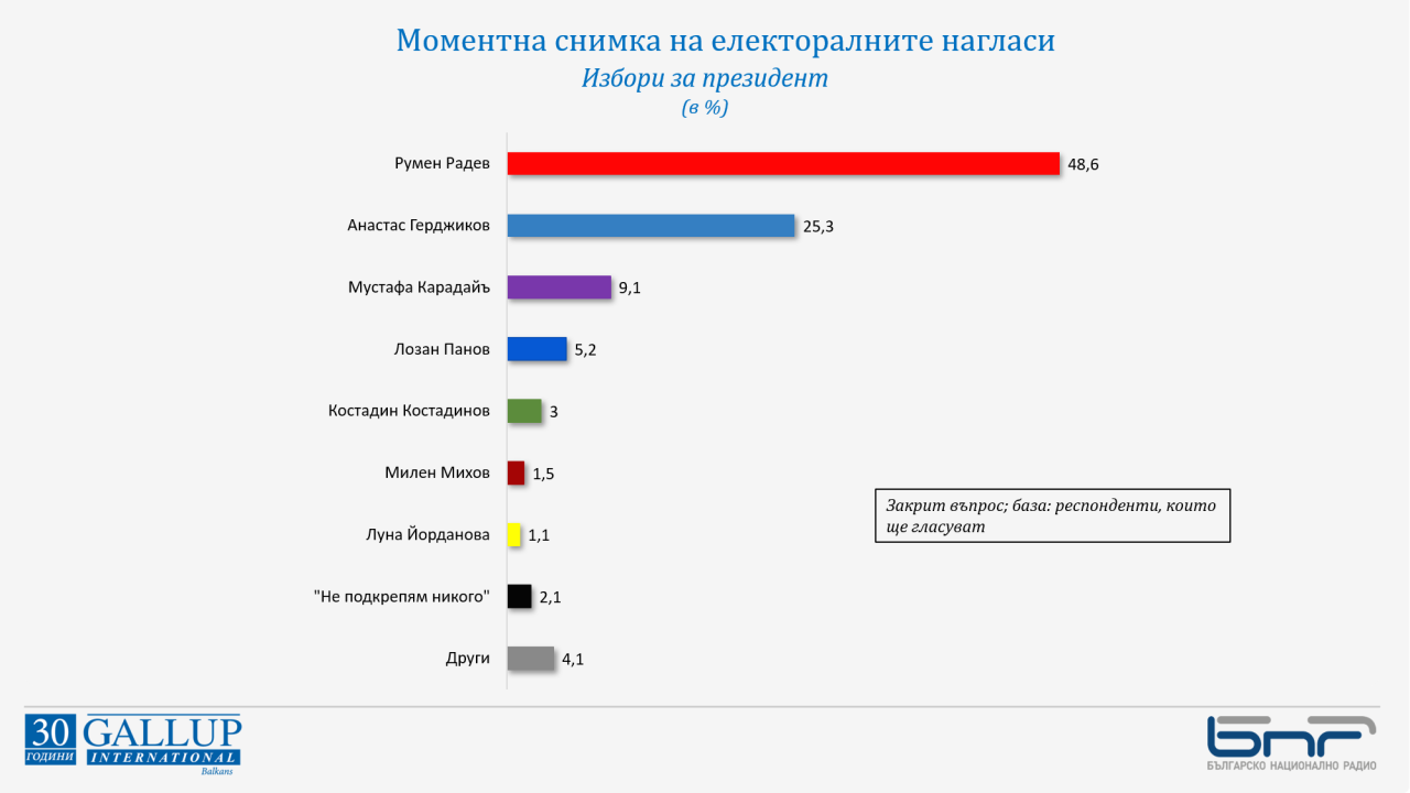 Ако президентските избори бяха в края на първата десетдневка на ноември, 48,6% биха гласували за Румен Радев, 25,3% – за Анастас Герджиков, 9,1% – за Мустафа Карадайъ, 5,2% – за Лозан Панов, 3% – за Костадин Костадинов, 1,5% за Милен Михов. 1,1% казват, че ще гласуват за Луна Йорданова. 2,1% казват, че ще гласуват с „Не подкрепям никого“. 4,1% ще предпочетат други опции.