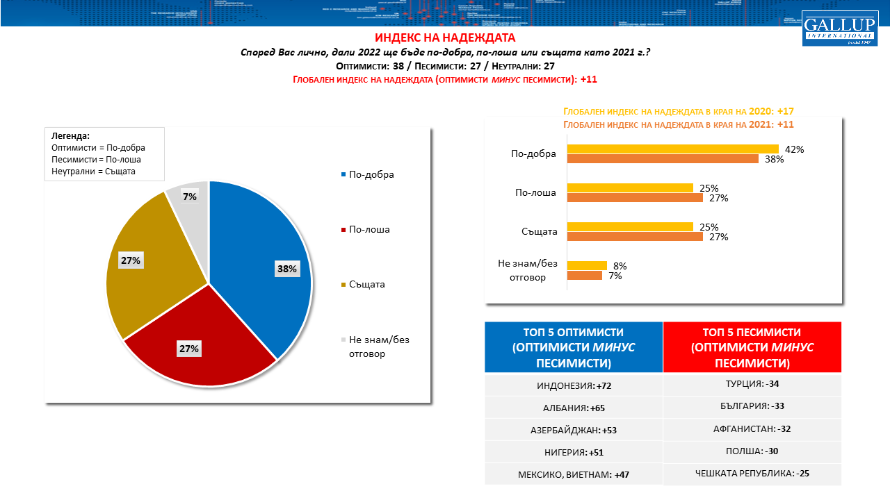 Така нетната стойност на Индекса на надеждата у нас е -33. Миналата година страната ни отново беше сред 5-те най-песимистични държави в изследването с индекс на надеждата - 29. Преди нас се нарежда единствено Турция (-34). Плътно зад нас пък са Афганистан (-32), Полша (-30) и Чехия (-25).