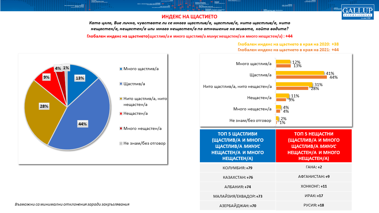 Индексът на щастието за страната тази година е +35, което е поставя България близо до центъра на списъка от общо 44 държави, включени в изследването. За сравнение в края на миналата година индексът за България е +31.