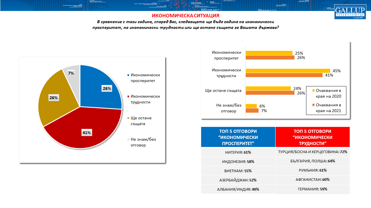 В края на 2021 г. две трети от българите се готвят за икономически трудности през идната година, едва 6% залагат на икономически просперитет, а всеки пети смята, че нищо няма да се промени в икономиката. Един от десет се затруднява да прецени.