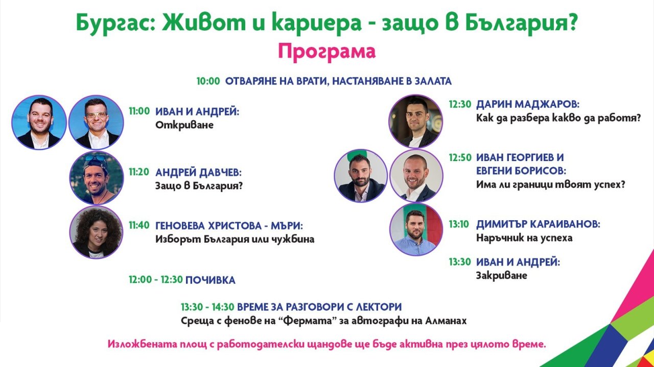 „Живот и кариера – защо в България?“ е първото по рода си събитие в Бургас. В рамките на 5 часа, освен вдъхновяващи истории на успеха, посетителите ще могат и лично да се запознаят с потенциални бъдещи работодатели. Със свои щандове ще присъстват 22 от най-отговорните компании в страната.