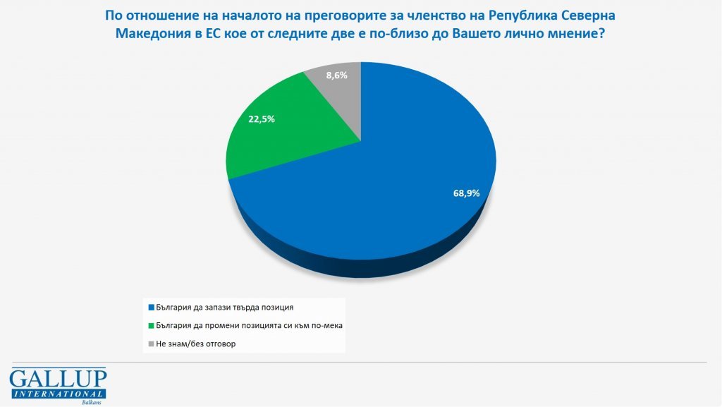 68,9% от българите подкрепят тезата, че България трябва да запази твърдата си позиция спрямо присъединяването на Република Северна Македония в ЕС. Малко над една пета са на обратното мнение – България да промени позицията си към по-мека. Това показват данните от последния сондаж по темата на „Галъп интернешънъл болкан“.