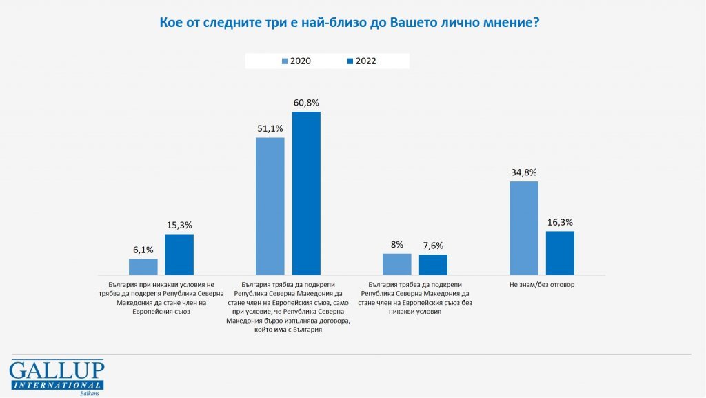 В началото на 2022 г., 60,8% избраха опцията Македония да бъде допусната, но само при изпълнение на договора. Съпоставка с ноември 2020 г., когато въпросът отново беше активно обсъждан, ясно показва, че позицията по този въпрос сред българите е втвърдена – делът на отговори „само след изпълнение на договора“ през 2020 г. беше 51,1%, т.е. десет пункта по-нисък, отколкото сега. За безусловно допускане на Македония по пътя към ЕС в началото на тази година бяха 7,6%, а през 2020 г. – сходен дял от 8%. Най-сериозен е ръстът за година и половина на онези, които са крайни в желанието си Скопие да не бъде допускано: 15,3% сега, срещу 6,1% през 2020 г.