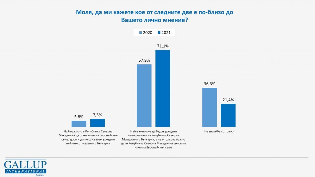 В рамките на две поредни години (2020 г. и 2021 г.), както на въпроса за членството на Северна Македония, така и при този, се наблюдава спад сред колебаещите се и заемане на по-твърда позиция. В рамките на година делът на отговорилите, че най-важното е Северна Македония да уреди отношенията си с нас, а не толкова дали ще влезе в ЕС, е нараснал с 13 процентни пункта – отново за сметка на зоната на колебаещите се. Делът на обратните отговори може би е набъбнал леко – от 5,8% на 7,5%.