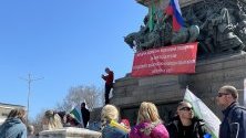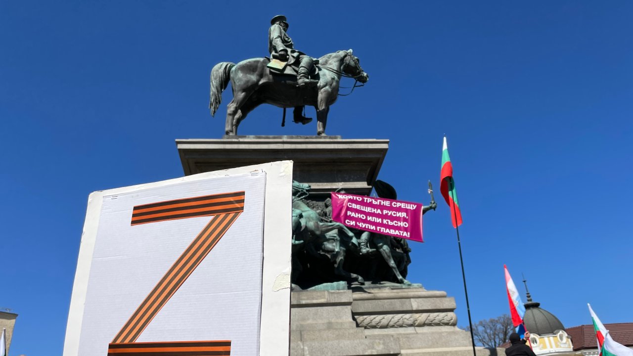 Въпреки че наскоро лидерът на „Възраждане“ се обяви против по българските площади да се веят чужди замена, визирайки украинското по време на шествието на 24 март в подкрепа на Украйна, в момента на протеста се забелязва, освен българския, и руския флаг. Един от тях дори е закачен и се развява от Паметника на Цар Освободител. На него е окачен и голям червен плакат с правописна грешка, на който пише: „Мощна морална и духовна подкрепа за братска Русия от целият български народ и България! Започна се!!!“.