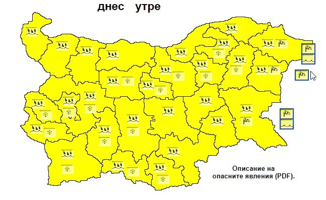 Рязко застудяване в цялата страна. В цяла България е обявен жълт код за валежи от дъжд, които в повечето области, включително в столицата, ще преминат в сняг. В крайните източни райони валежите ще бъдат придружени от силни ветрове.