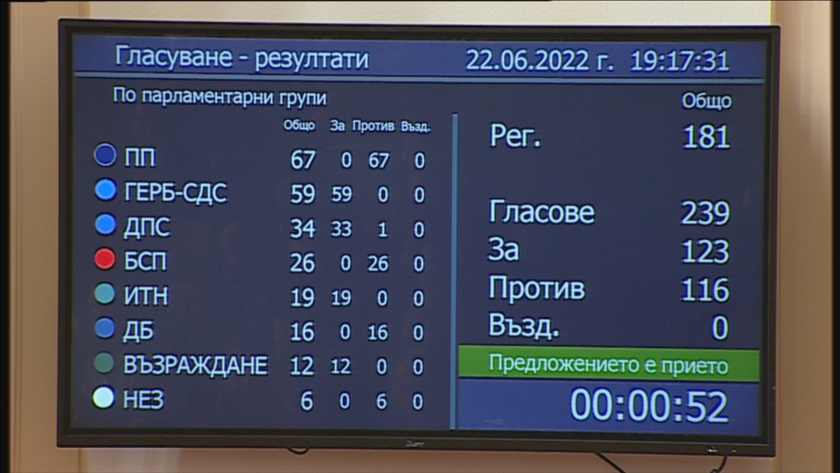В подкрепа на вота на недоверие гласуваха 123 депутати от ГЕРБ, ДПС, „Възраждане“ и ИТН. Срещу гласуваха 116 депутати от управляващата коалиция на „Продължаваме промяната“, БСП и „Демократична България“. Не се сбъднаха надеждите на властимащите, кабинетът да получи подкрепа от отделни депутати от останалите парламентарни групи.