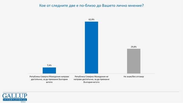 62.8% от пълнолетните българи смятат, че Северна Македония не е направила достатъчно България да премахне ветото. Под една десета смятат, че РСМ е направила достатъчно. Данните затвърждават наблюденията, че позицията на българското общество по темата остава твърда и непроменена. Това са традиционните нива по тези въпроси.