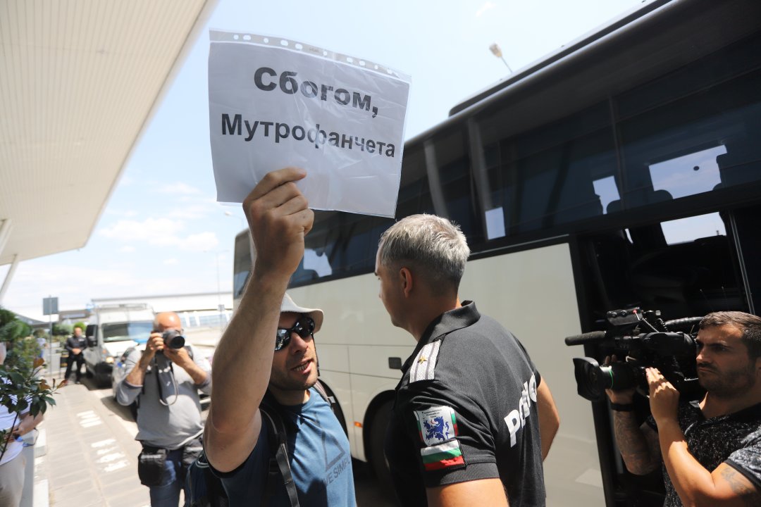 При слизането си от автобусите руските граждани бяха посрещнати с гневни скандирания за сбогом и с табела с надпис „Сбогом, Мутрофанчета“ от българин, който се представи като европейски представил и евроатлантик. „Аз съм един европейски представил и съм тук, за да изпратя тези дипломати. Всъщност те са шпиони под прикритието на дипломатическия си имунитет и с голяма радост ги изпращаме оттук. Не виждаме да носят тоалетни чинии, но да се надяваме, че ще си намерят по пътя някъде“, каза той пред „DarikNews“.