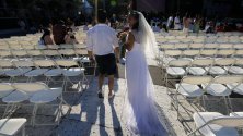 Стотици двойки с провалени сватби заради пандемията потвърдиха обетите си пред центъра „Линкълн“ в Ню Йорк, съобщиха Асошиейтед прес и Франс прес.
