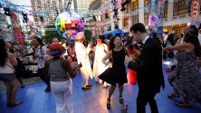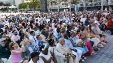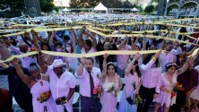 Церемонията „Честване на любовта: (повторна) сватба“ беше в павилион пред културния център в неделя вечерта. В нея участваха 500 двойки.
