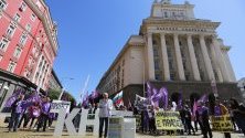 На протеста са издигнати плакати с надписи „Инфлацията расте, доходите не“, „Справедлива и адекватна минимална заплата“, „Повече така не може“, „Зелена сделки – европейски заплати“.