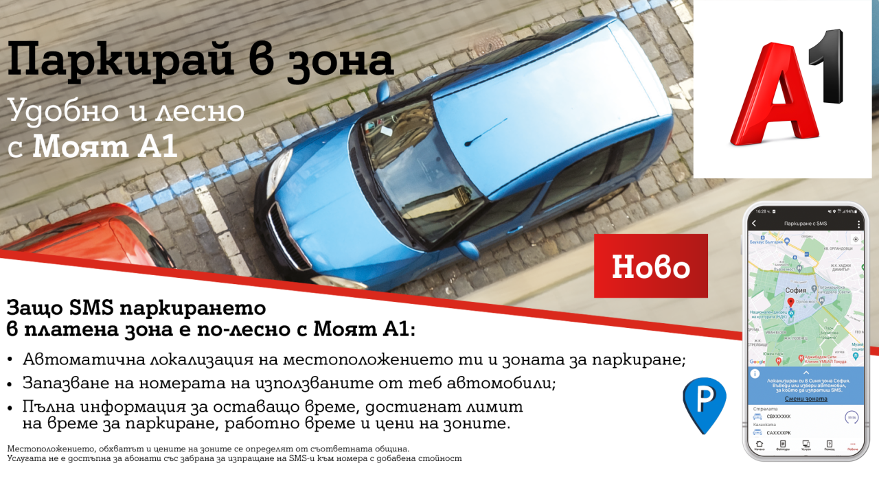 Липсата на информация за тарифи, граници и работно време е проблем, с който се е сблъсквал всеки у нас при паркиране в платените (сини и зелени) зони. Неволните грешки при SMS изписването на номера на автомобила пък винаги носят риск от солена глоба. Нова функционалност на приложението „Моят A1” дава решение на всичко това, като предлага на потребителите възможност лесно да управляват платения престой на автомобилите си.