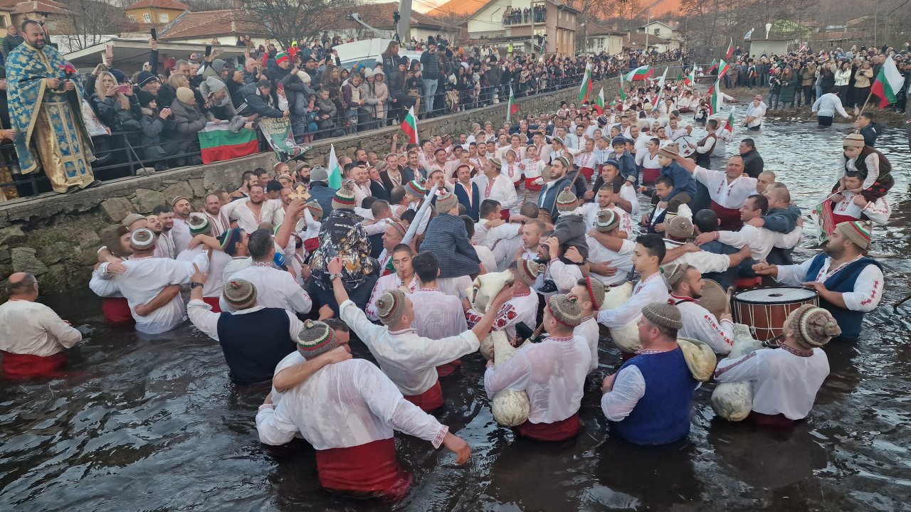 Мъжкото хоро влиза във водите на реката, които тази година не са ледени, но са достатъчно студени, да пречистят и калят смелчаците.