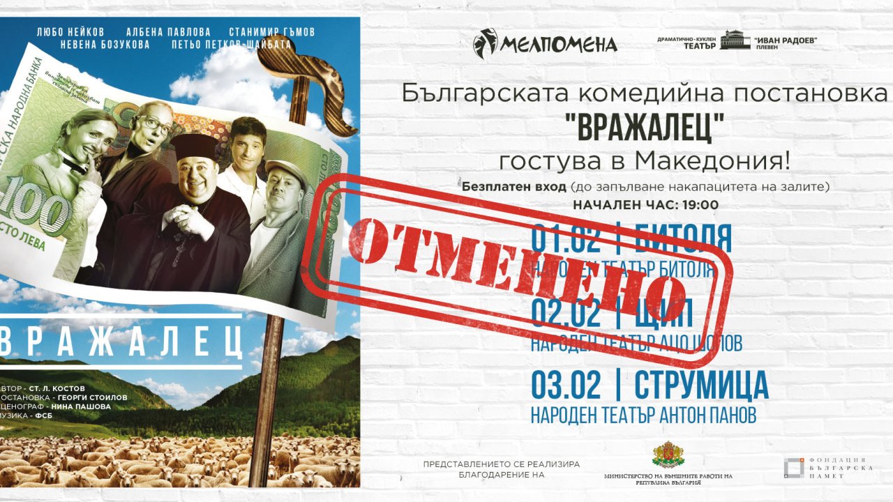 Българската театрална постановка „Вражалец”, която трябваше да зарадва зрителите в три македонски града в началото на февруари, няма да се състои.