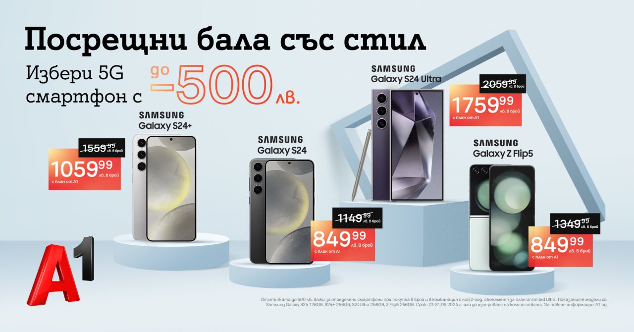През май смартфоните от серията Galaxy на Samsung се предлагат от А1 на специални промоционални цени с отстъпки до 500 лева от цената в брой. 5G устройствата се предлагат с план Unlimited с 50% отстъпка за първите 6 месеца от договора и в различни разновидности на паметта.