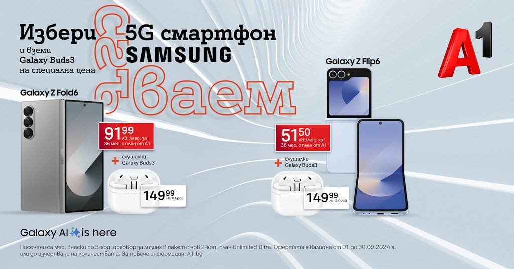 До края на септември всеки, закупил един от най-новите сгъваеми смартфони на Samsung – Galaxy Z Flip6 или Galaxy Z Fold6 от А1, може да се сдобие със слушалки Galaxy Buds3 на специална цена.