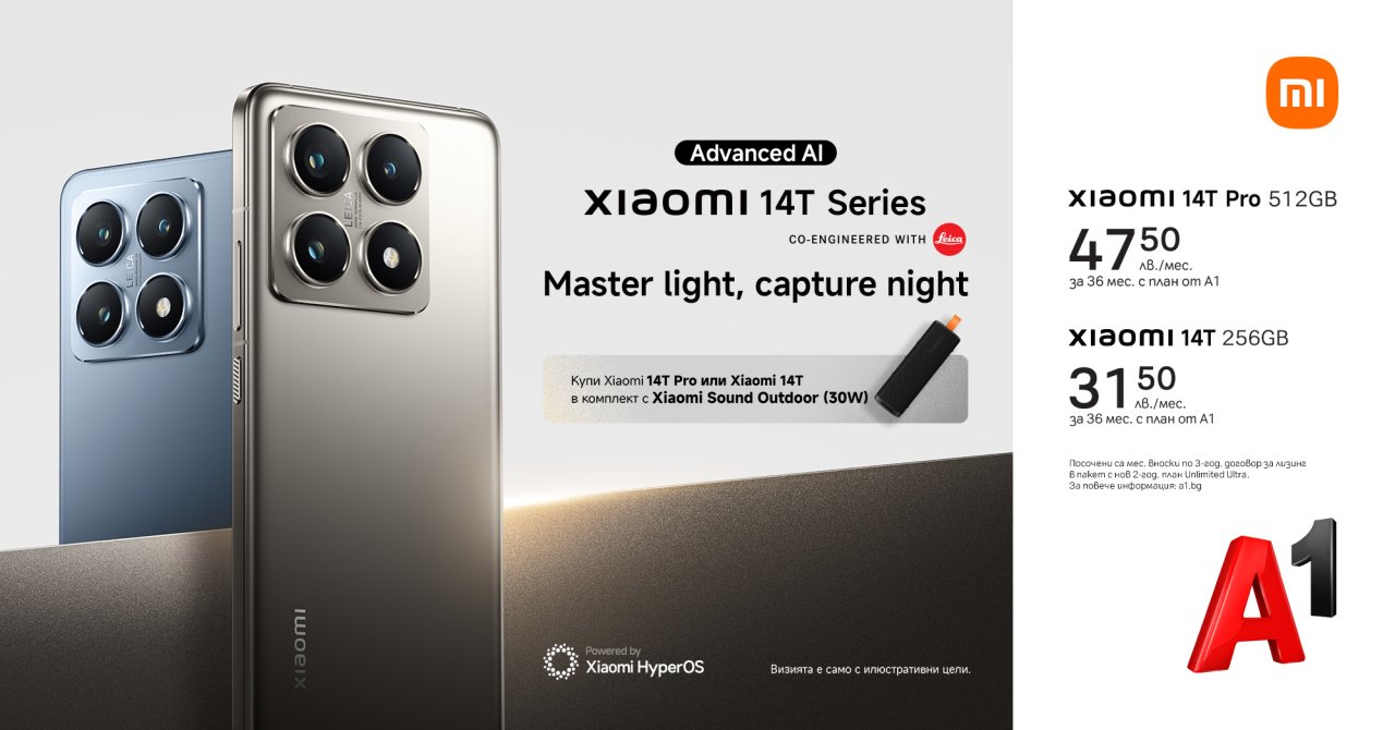 Новите флагмани Xiaomi 14T и Xiaomi 14T Pro са вече налични в магазините на A1 и онлайн на A1.bg. Смартфоните са най-новото попълнение в портфолиото на бранда и идват с редица иновативни функции и подобрено фотографско изживяване. Моделите могат да бъдат закупени както в брой, така и на лизинг с план Unlimited Ultra. Xiaomi 14T 256 GB е достъпен срещу 31,50 лева на месец или 919,99 лева в брой, а Xiaomi 14T Pro 512 GB срещу 47,50 лева на месец или 1 379,99 лева в брой. И двете устройства се предлагат в комплект с Xiaomi Sound Outdoor (30W).