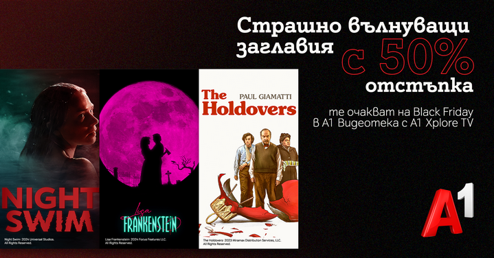 По случай Black Friday избрани заглавия от различни жанрове ще бъдат достъпни на половин цена за потребителите на А1 Видеотека. В периода от 25 ноември до 2 декември клиентите на Xplore TV могат да наемат филми за 48 часа с 50% отстъпка от редовната цена. Част от селекцията са известни продукции като „Заседнали“, „Лиза Франкенщайн“, „Нощно плуване“ и други.
