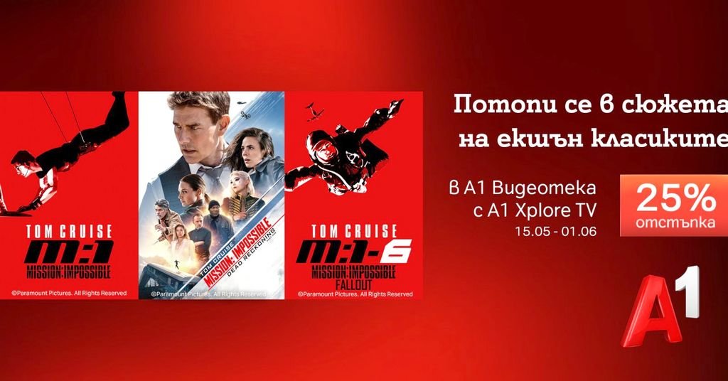 От 15 май до 1 юни абонатите на А1 Видеотека на A1 Xplore TV ще могат да се потопят в света на „Мисията: Невъзможна“ – една от най-успешните екшън поредици в киното. Всички филми от селекцията ще бъдат достъпни с 25% отстъпка от стандартната цена за наемане.