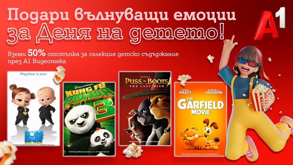 От 30 май до 13 юни Видеотеката на A1 Xplore TV празнува Деня на детето със селекция от любими филми за цялото семейство на специална цена – с 50% отстъпка. Заглавията могат да бъдат наети за 48 часа и гледани неограничен брой пъти, превръщайки всяка вечер в незабравимо семейно преживяване.