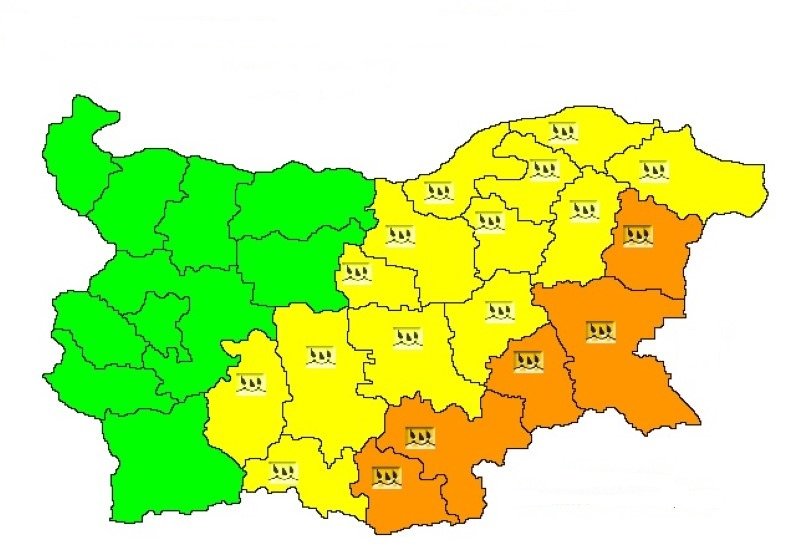 За областите Варна, Бургас, Ямбол, Хасково и Кърджали кодът е оранжев. Там ще има условия за опасни валежи - на места до нови 60 л/кв.м.