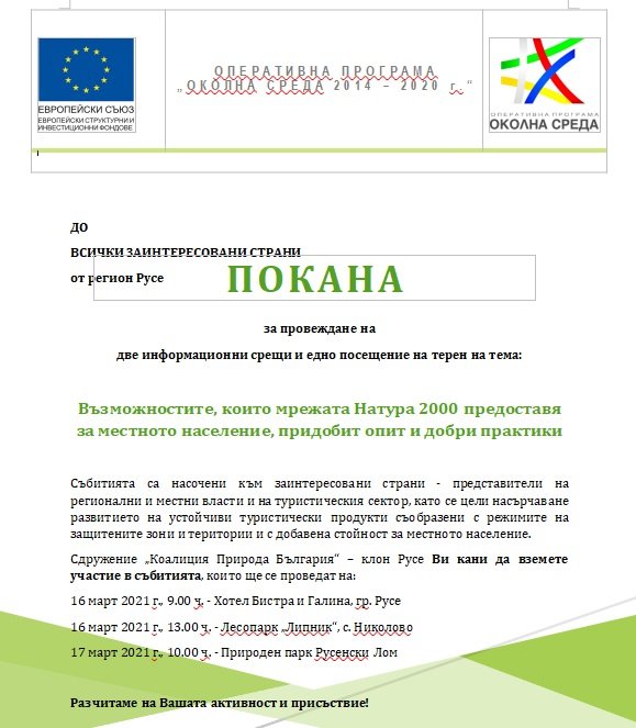 Сдружение „Коалиция Природа България“ организира две информационни срещи и едно посещение на терен на тема „Възможностите, които мрежата „Натура 2000“ предоставя за местното население, придобит опит и добри практики“.