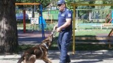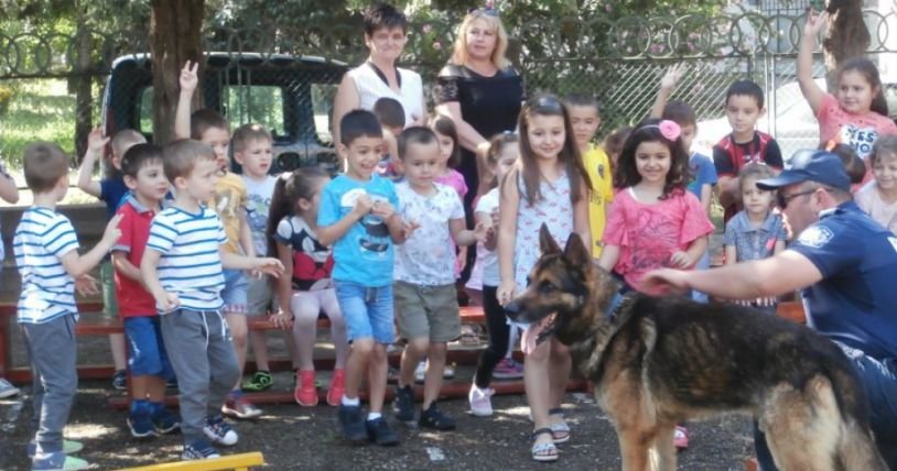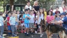 Следовото куче Верон демонстрира своите умения в помощ на полицаите в тяхната работа по случай 5 юли – професионалният празник на служителите от вътрешното ведомство, пред около 60 деца на възраст от 3 до 7 години- от Детска градина „Пчелица“ в гр. Търговище.