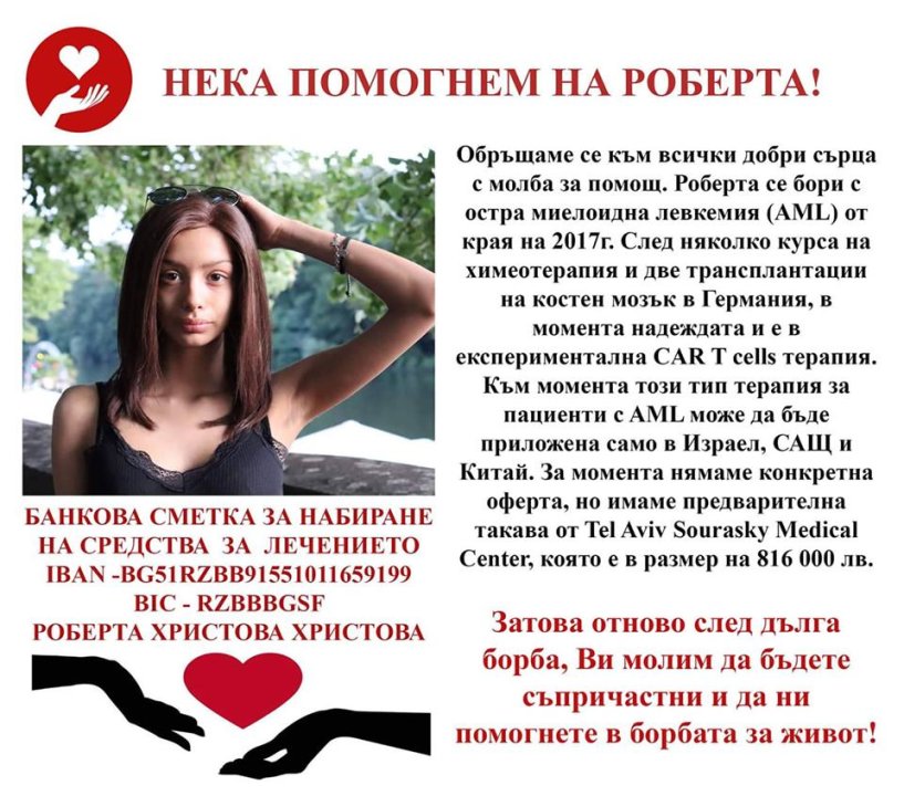 19-годишната Роберта Христова от Ямбол се бори с тежката болест остра миелоидна левкемия (AML) от края на 2017г.